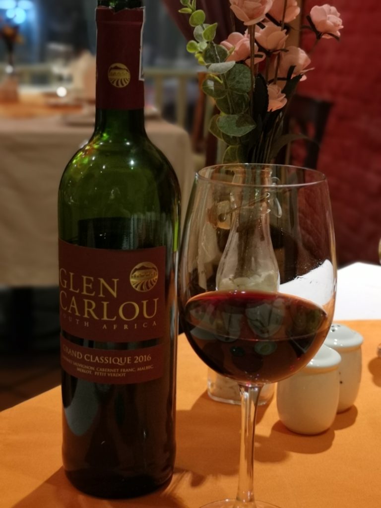 食事前のドリンクの注文ですが、ボトルワインを注文です。ワインは肉料理なので赤ワイン中心に結構取り揃えてあります。その中から今日は南アフリカのGlen Carlouを選びました。