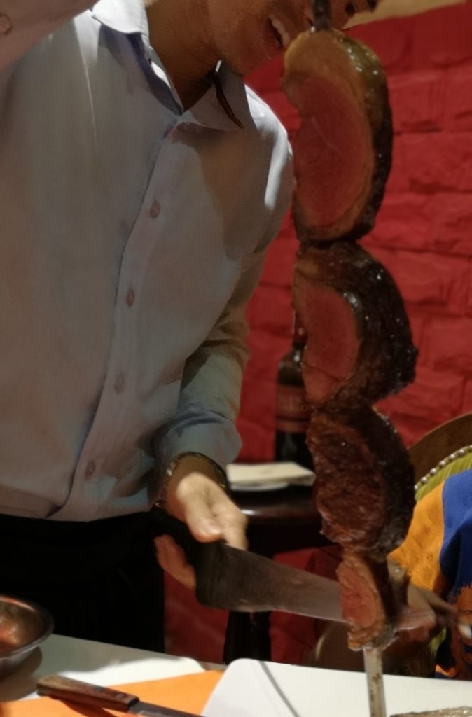 因みに、写真のコインがテーブルに置かれており、緑を表にしているとシュラスコは運ばれ続けます。赤色に裏返しておけば、満腹でシュラスコは要らないというサインになります。