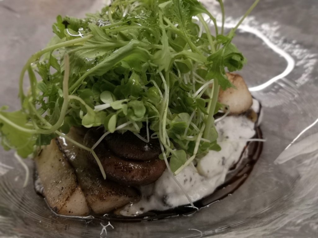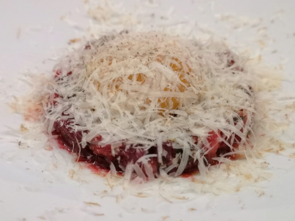 こちらは、最初のメニューのタルタルです。牛肉のたたきに卵の黄身だけを乗せスライスしたチーズをかけてあります。ビーフは生肉ではなく、しっかりと味付けされており、生肉が苦手な方でも楽しめるように工夫されています。更にスタイリッシュな料理が続きます。