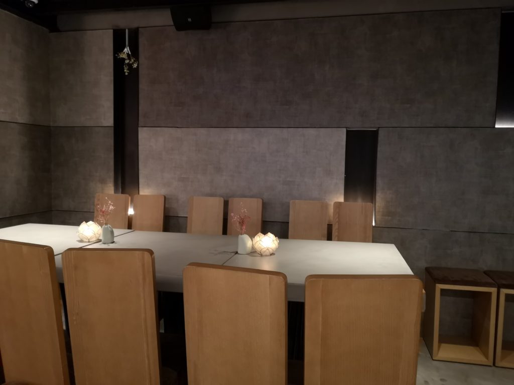 店舗の入口にサインがないのでわかりずらいのですが、店内に入ると2階に案内されます。2回はテーブル席とカウンター席になります。今回はキッチンがライブで楽しめるカウンター席に座りました。店内はこんな感じです。のどが渇いたスタッフが水を飲んでいますが、見逃してあげてください…。