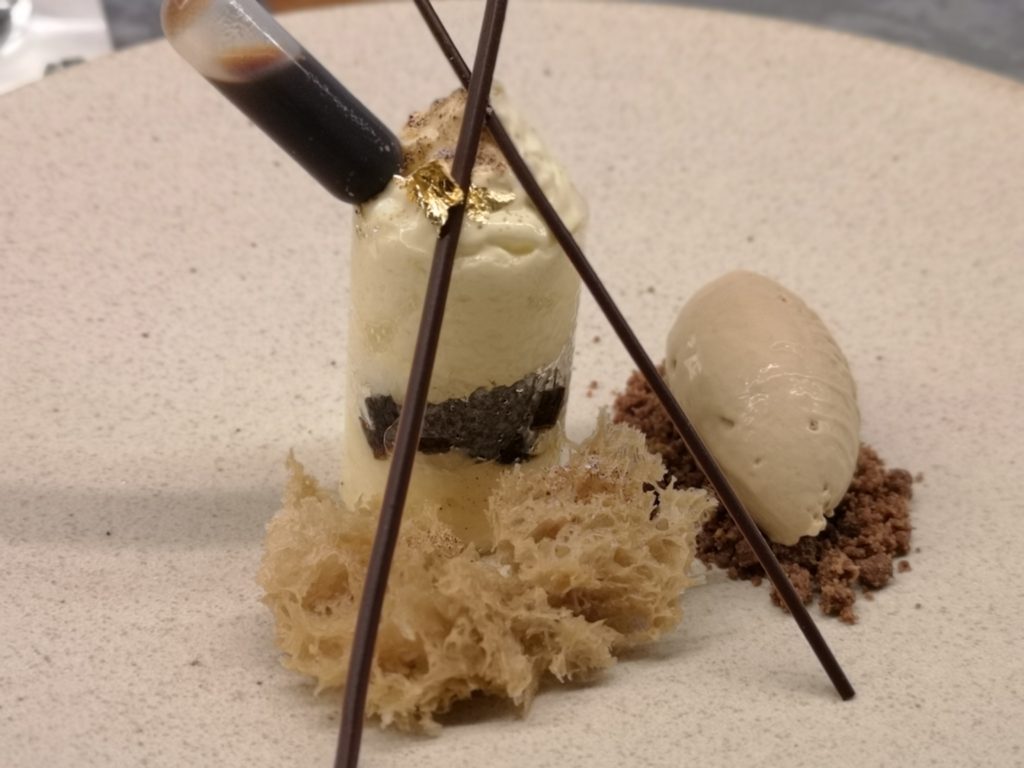 最後のデザートは左にあるスポイトにチョコレートが入っており、クリームケーキの中にチョコレートを入れてから食べます。最後まで斬新なアイディアが詰まっていました。